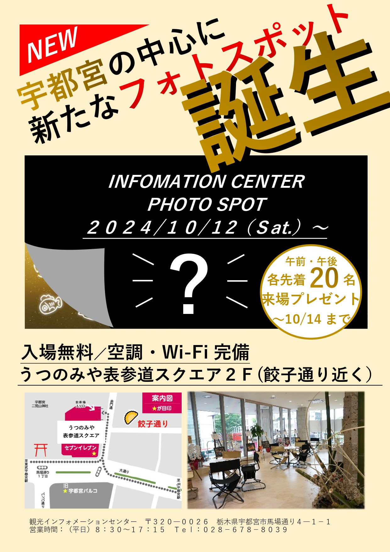 2024年10月12日(土)うつのみや表参道スクエア2階の観光インフォメーションセンターに新たなフォトスポットが誕生します。あわせて、皆さんオススメの店舗情報が記載できる口コミマップも設置します。
