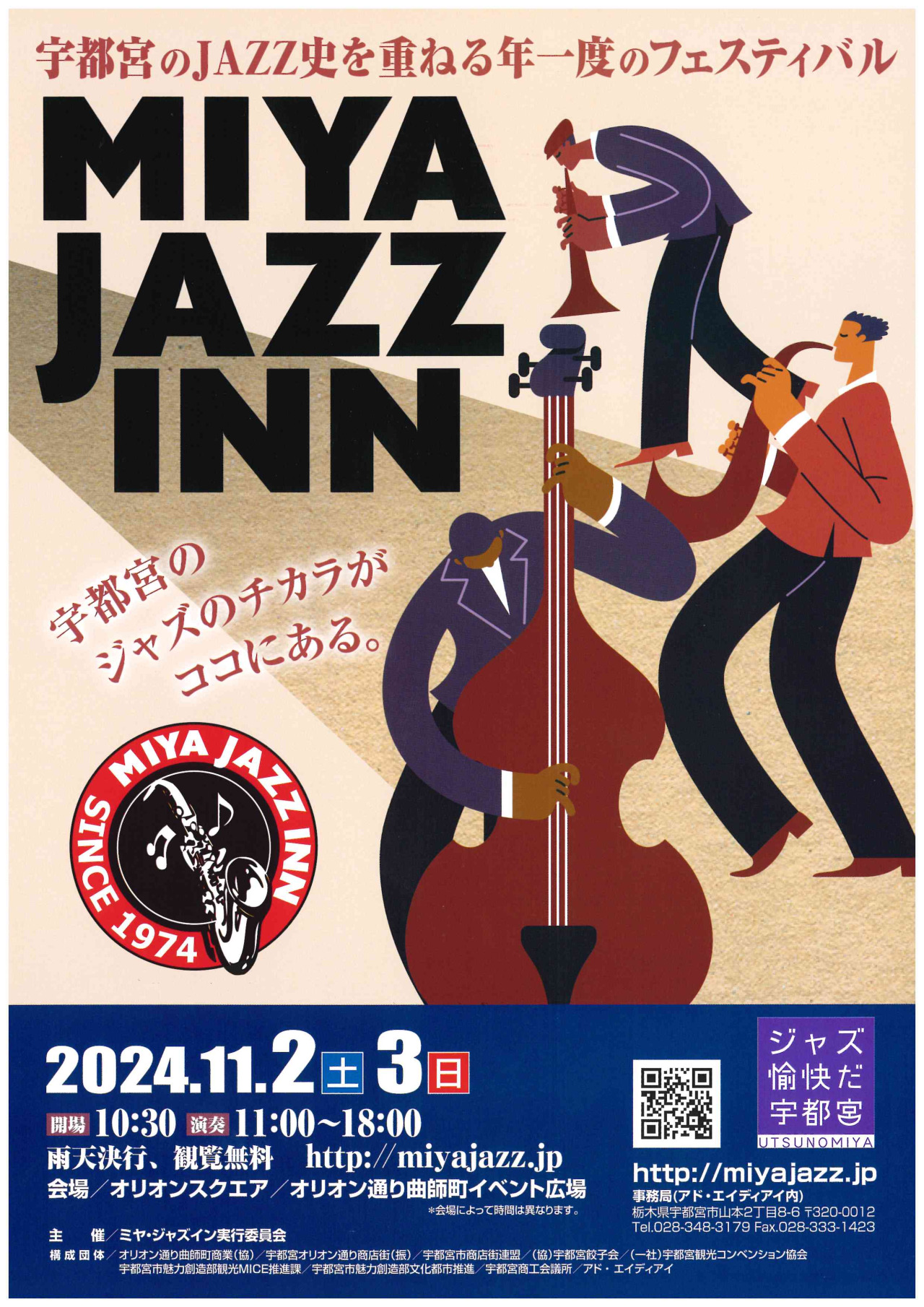 北関東最大、宇都宮のJAZZ史を重ねる年一度のフェスティバルが開催されます。市内のジャズイベントで最も古くから開催されており、「いつでも、どこでもジャズを感じる街」を目指している宇都宮の中でもフラッグシップとなるイベントです。今年は2024年11月2日(土)・3日(日)11:00~18:00、オリオンスクエアとオリオン通り曲師町イベント広場が会場ですので是非お出かけ下さい。