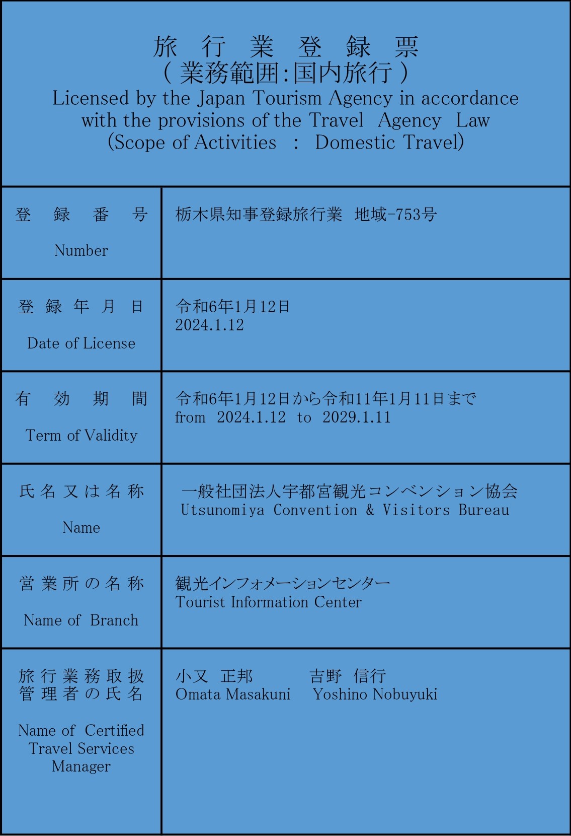 一般社団法人宇都宮観光コンベンション協会は2024年1月12日に地域限定旅行業を取得しました。