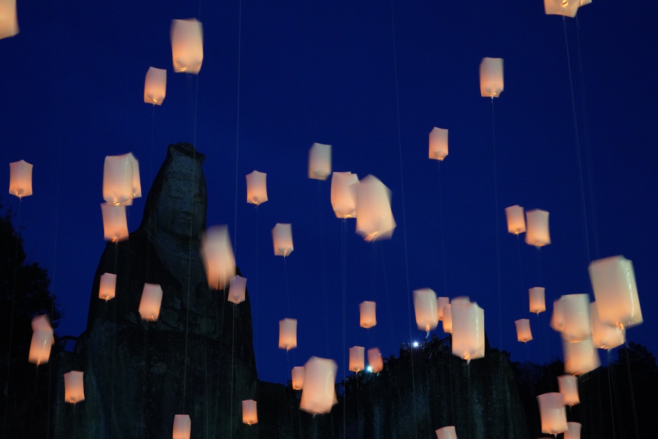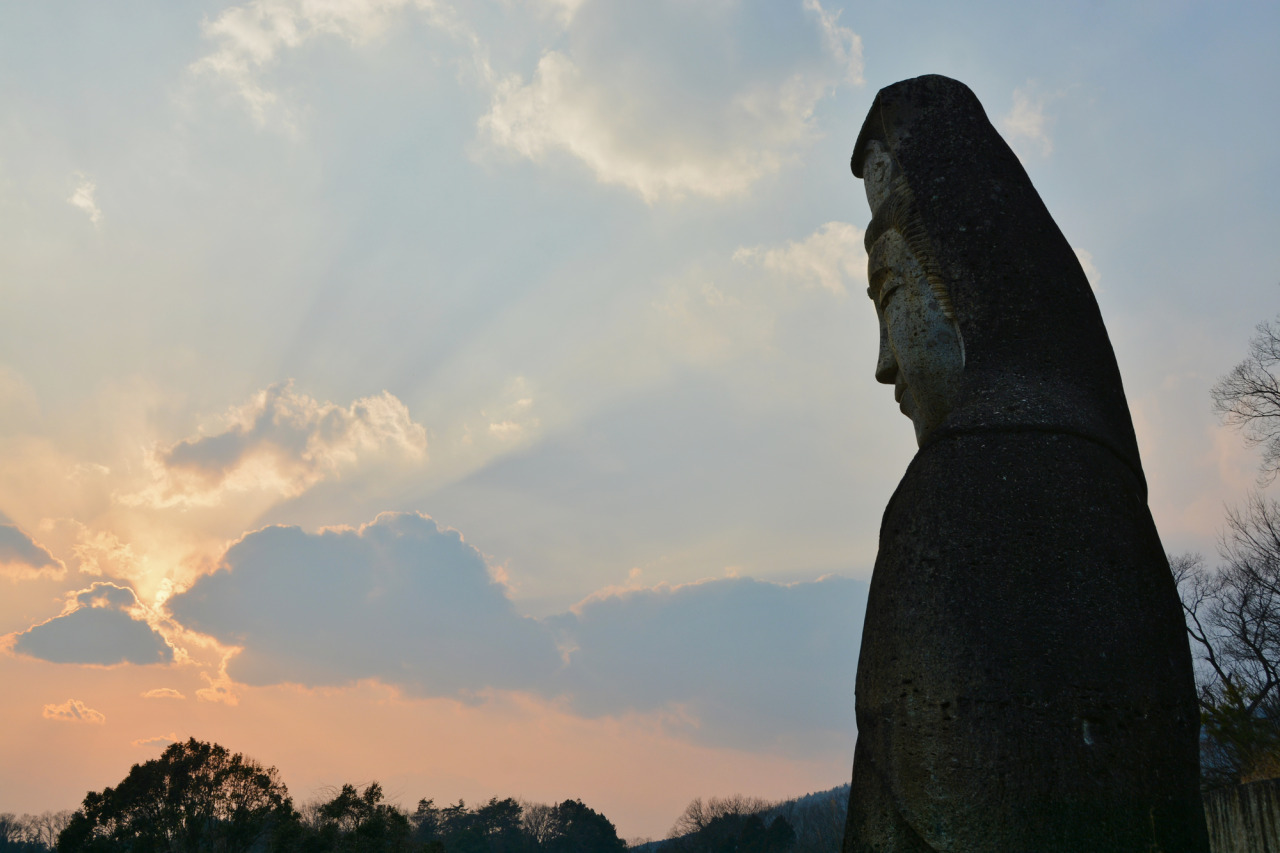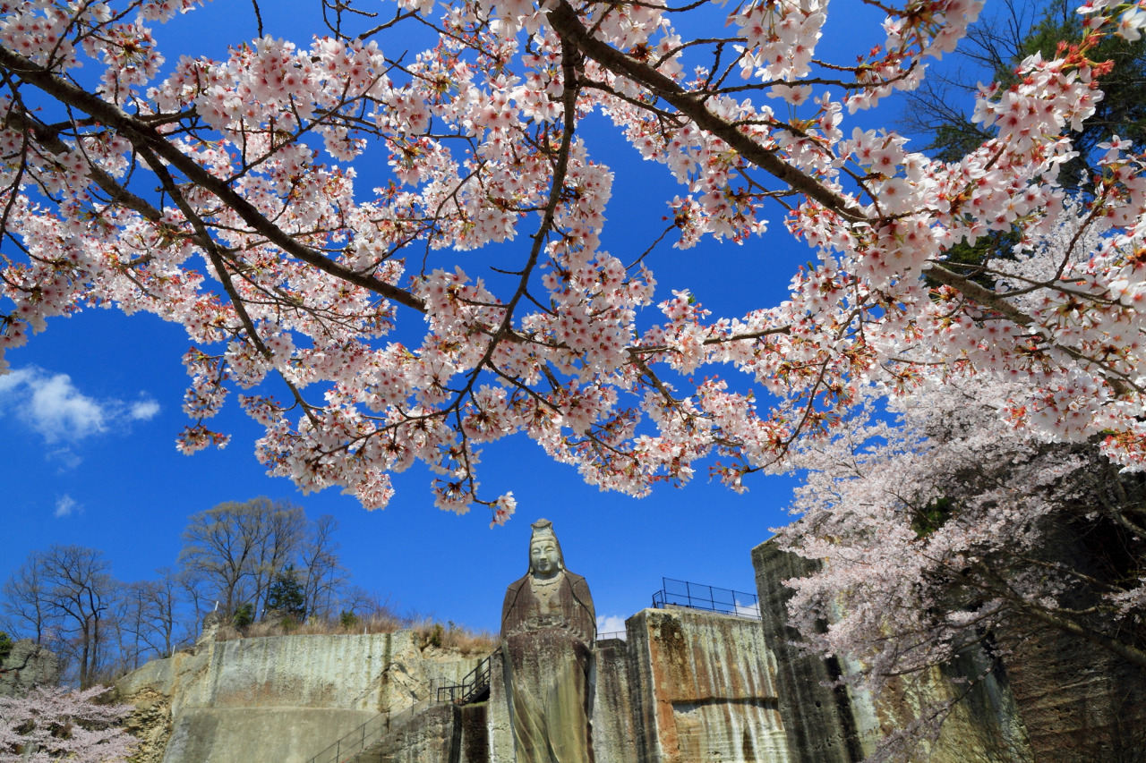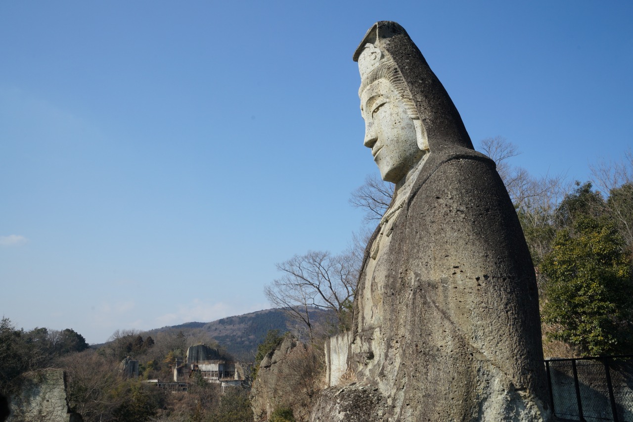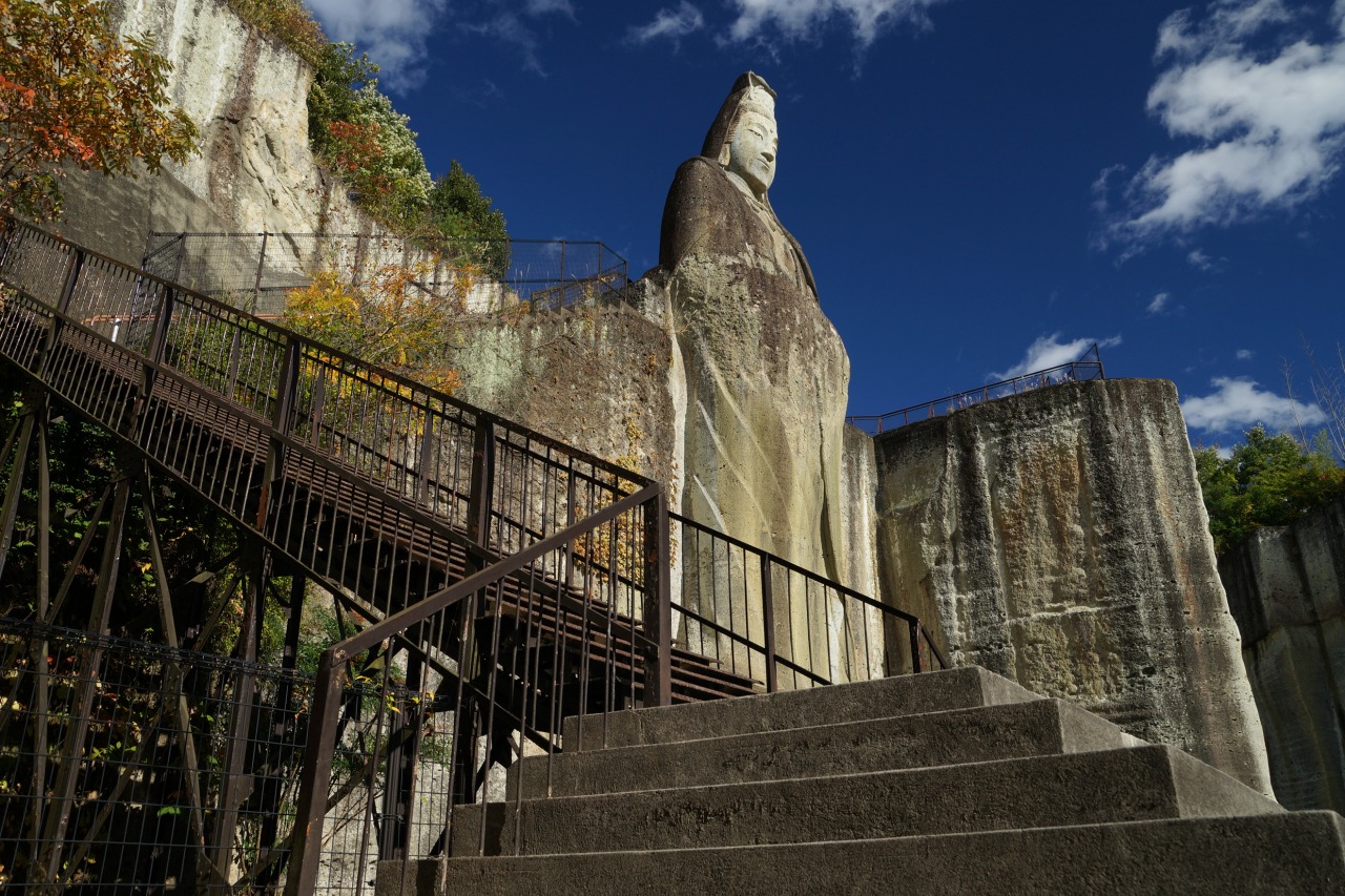 総手彫りで製作された高さ27mの優しいお顔の観音さま
