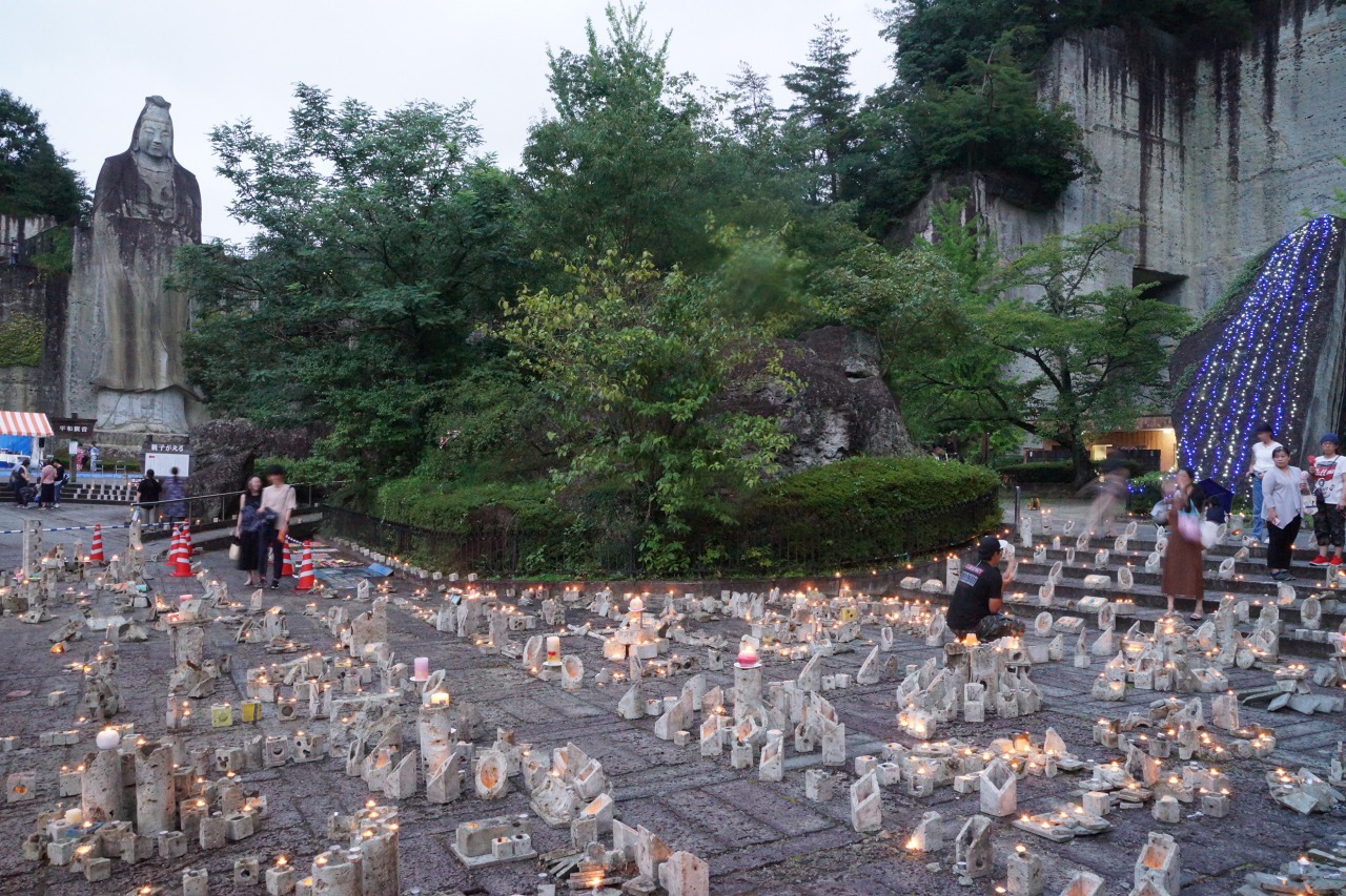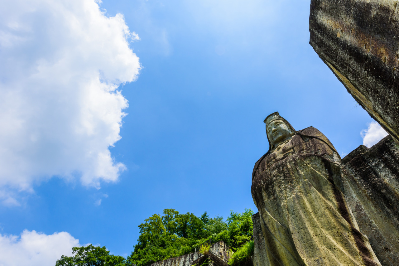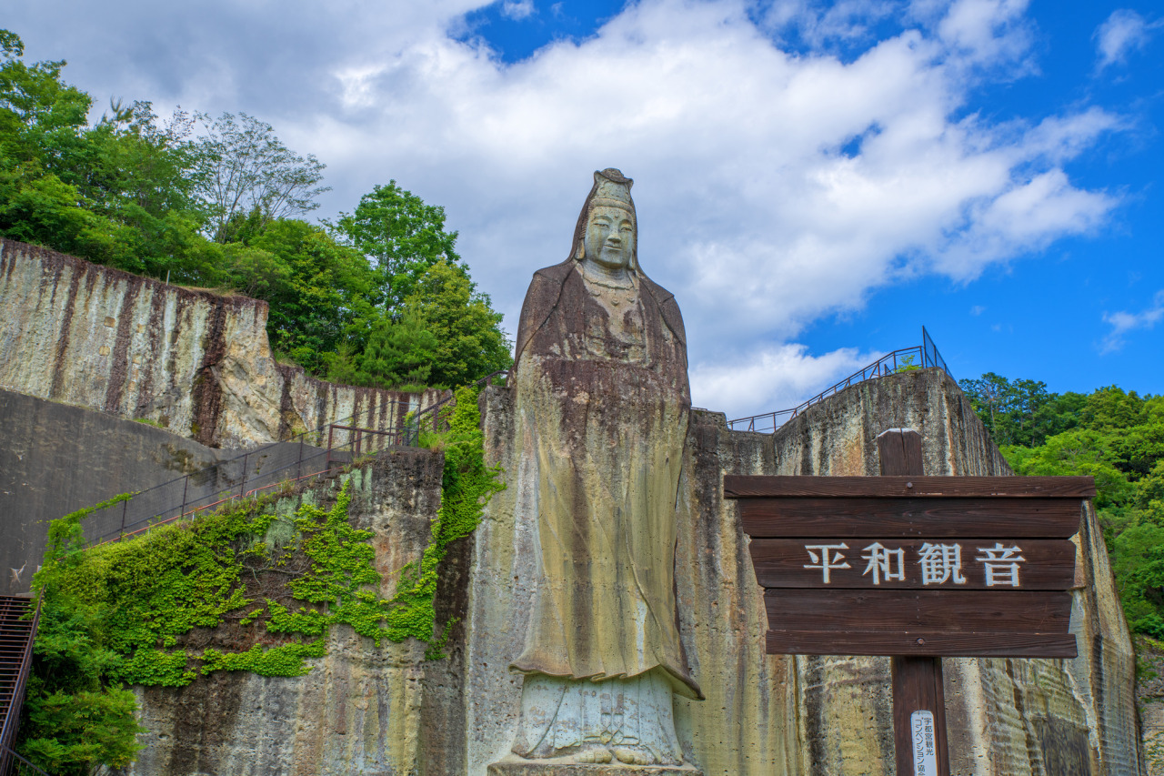 かつて屋外採掘場だった大谷石の岩壁に彫られた巨大な観音さま。戦没者の慰霊と世界平和を祈念して昭和23年より6年をかけ、総手彫りで製作されました。階段で上に登れば、大谷の町並みとともに、何とも言えない柔和なお顔を間近で眺められます。