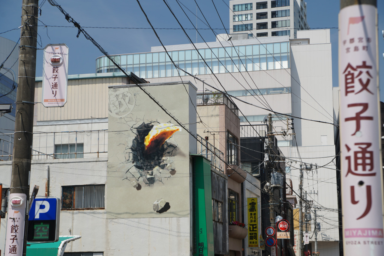 いたるところにある遊びごころいっぱいの餃子モチーフを見つけながら、昭和レトロ感溢れる通りを散策してみましょう。GYOZAの文字のモニュメントは絶好の撮影スポット。巨大な餃子はインパクト大です。また建物に餃子が刺さった餃子壁面アートも必見。