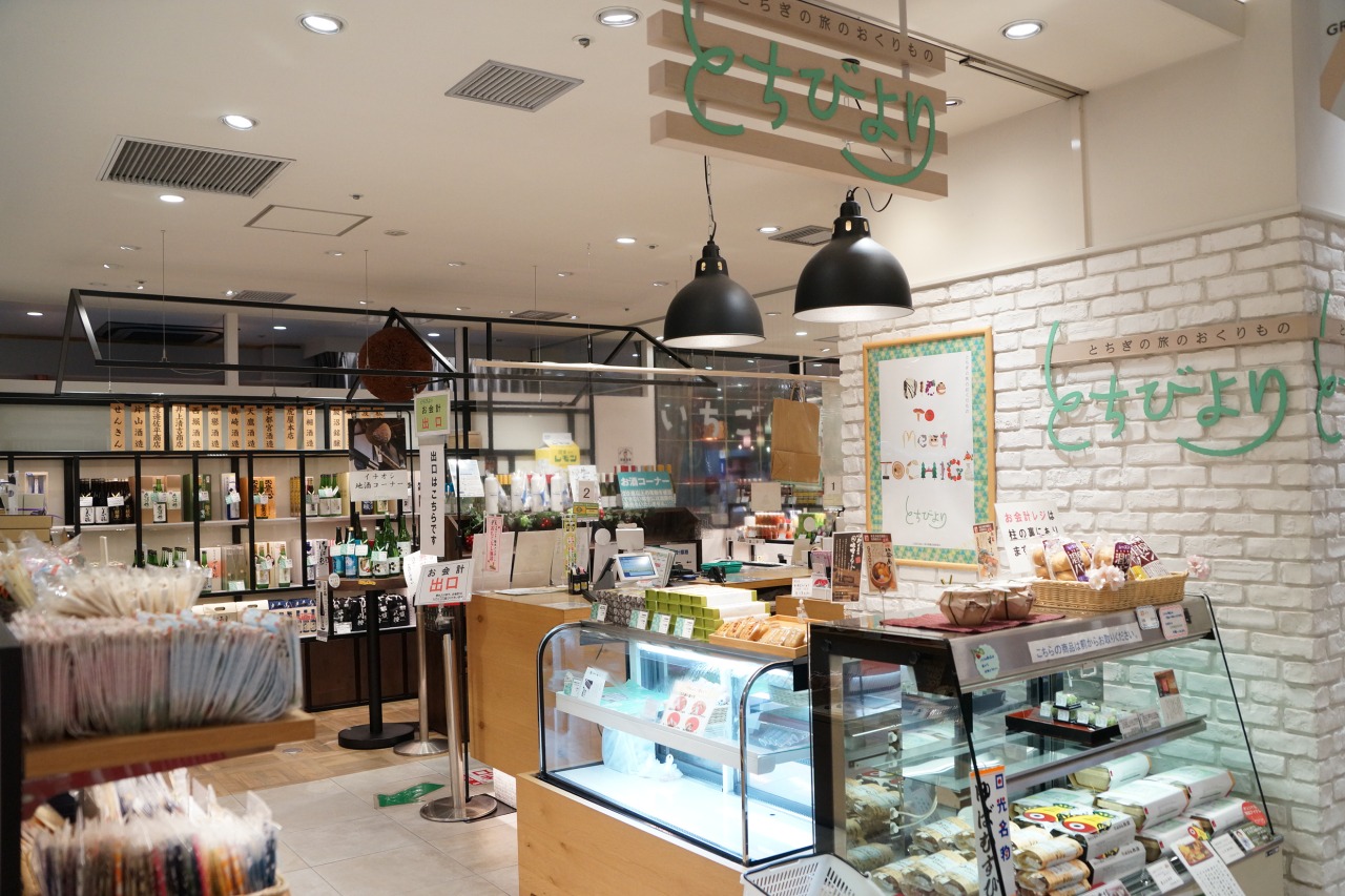 栃木のお土産店15店舗がずらりと並ぶ、ギフトショップ。宇都宮駅と直結する駅ビル「PASEO」の2Fにあるので、新幹線の待ち時間などを利用して気軽にショッピングを楽しむことができます。