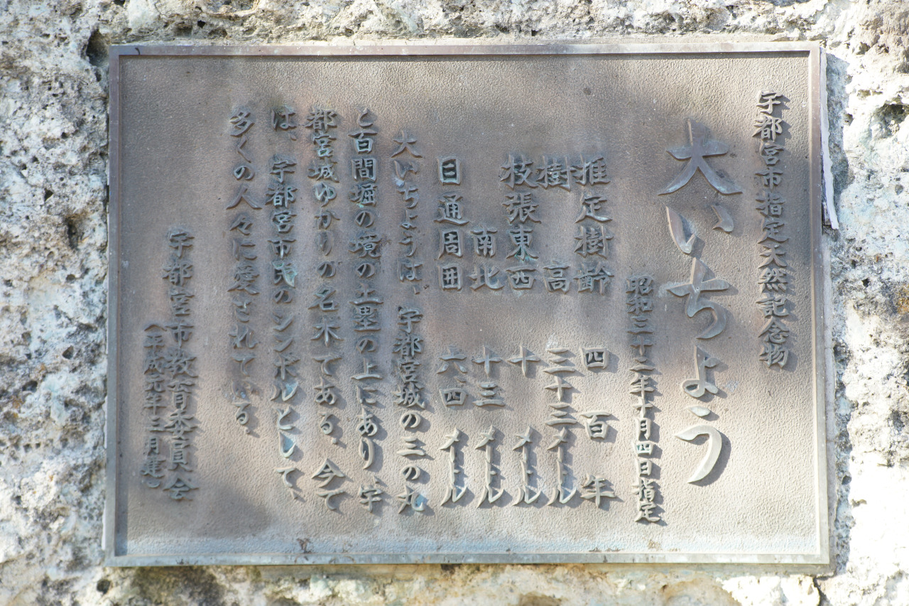 大いちょうは、宇都宮城の三の丸と百間堀の境の土塁の上にあり、宇都宮城ゆかりの名木です。樹齢約400年と推定されており、宇都宮市民のシンボルとして多くの人々に愛されています。