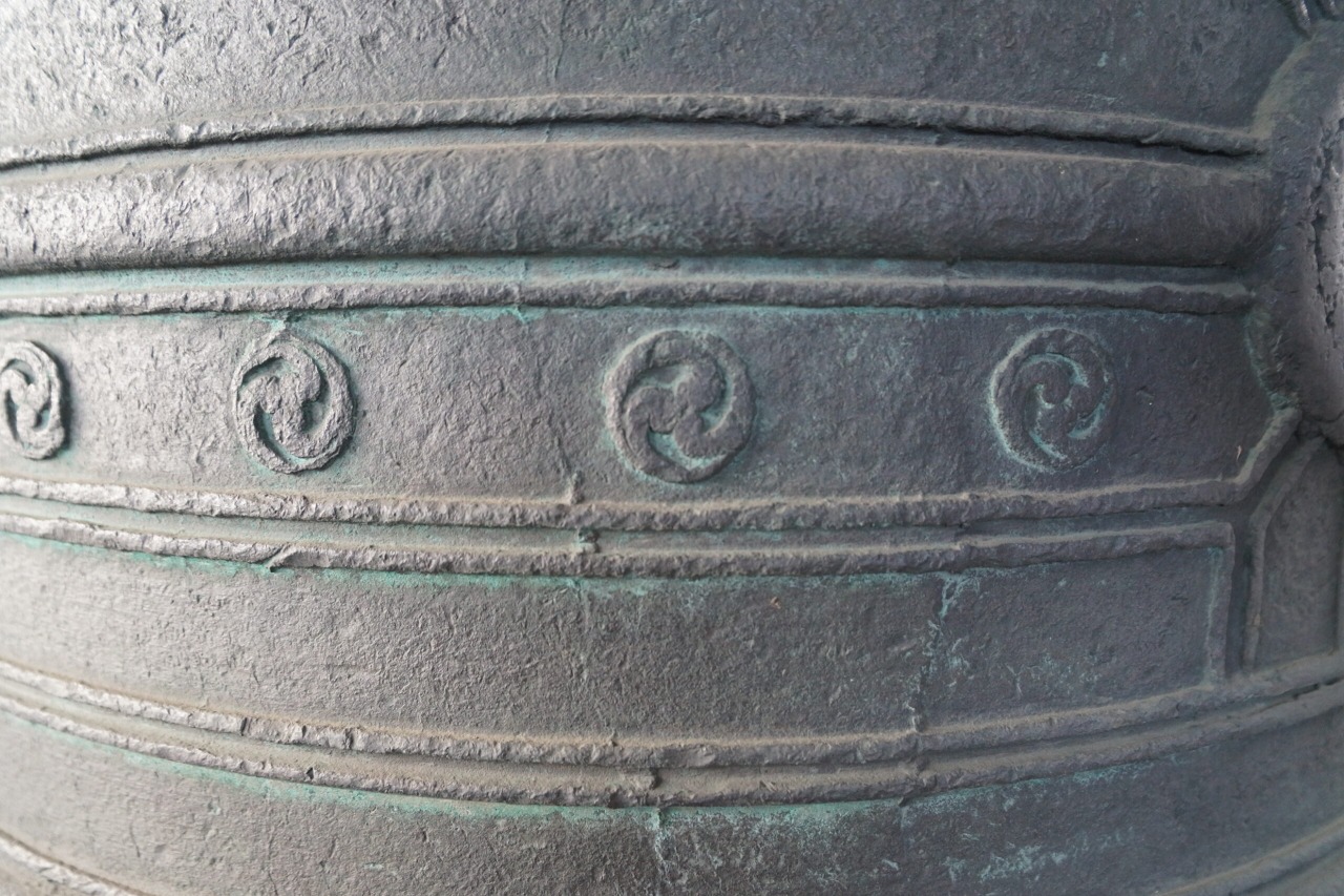 およりの鐘は宇都宮氏の滅亡によって廃寺となった東勝寺(日野町通り北側一帯の地)にあったものです。江戸時代には夕暮れになると鳴らされたので、「およりの鐘」として親しまれました。「おより(御寝り)」とは「お休みになる」の意味です。鋳造年代は不明ですが、鐘の中帯に宇都宮氏の家紋「三つ巴」が20個ほどついているので、宇都宮氏の寄進によるものと思われます。この鐘は、その後、様々ないきさつをたどって、昭和19(1944)年、宝蔵寺へ移され、今に至っています。