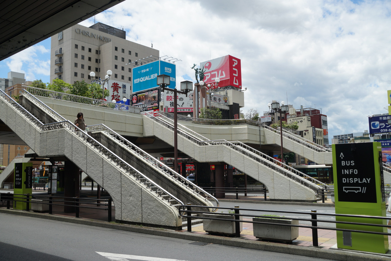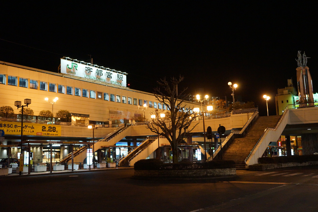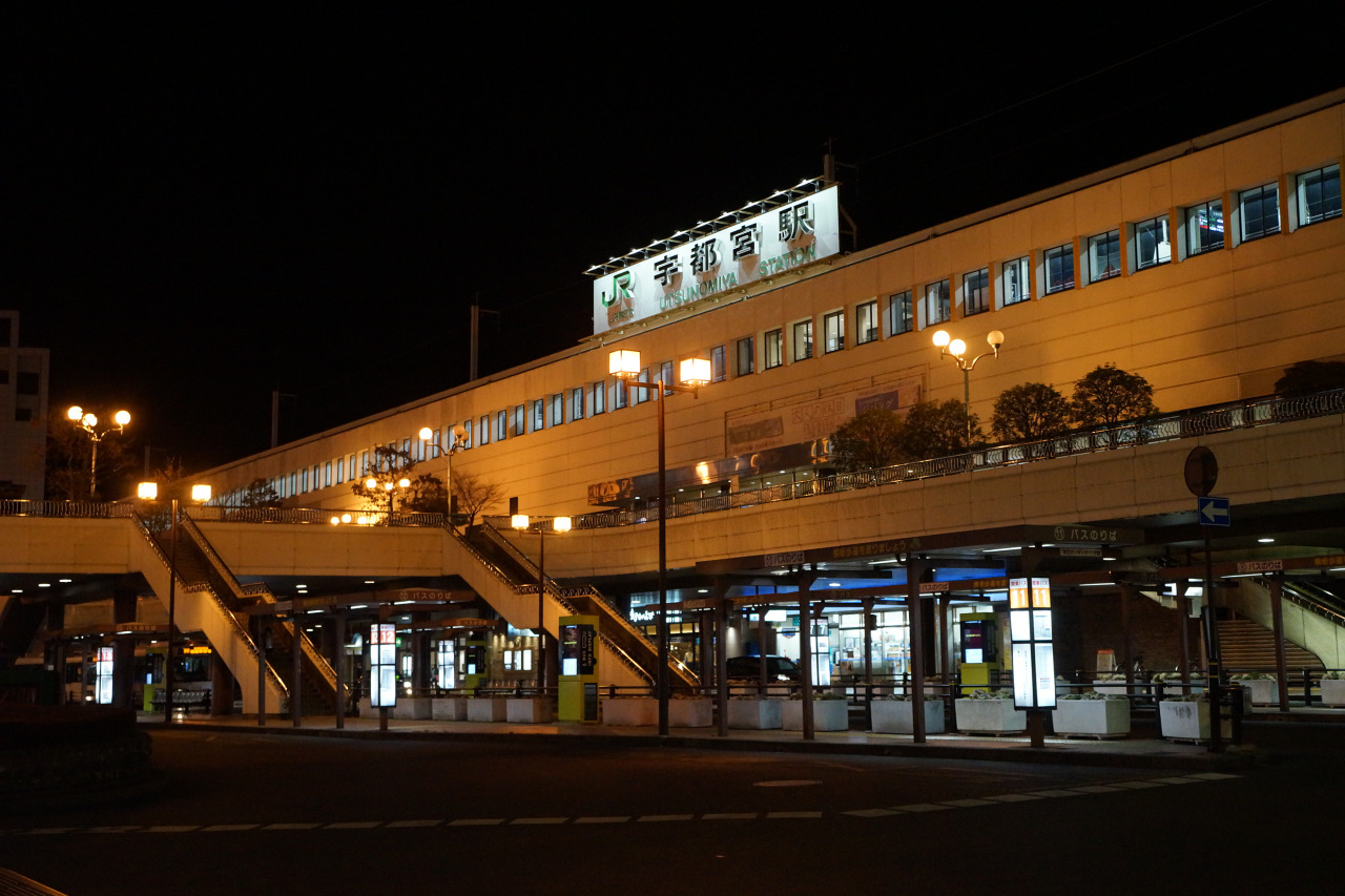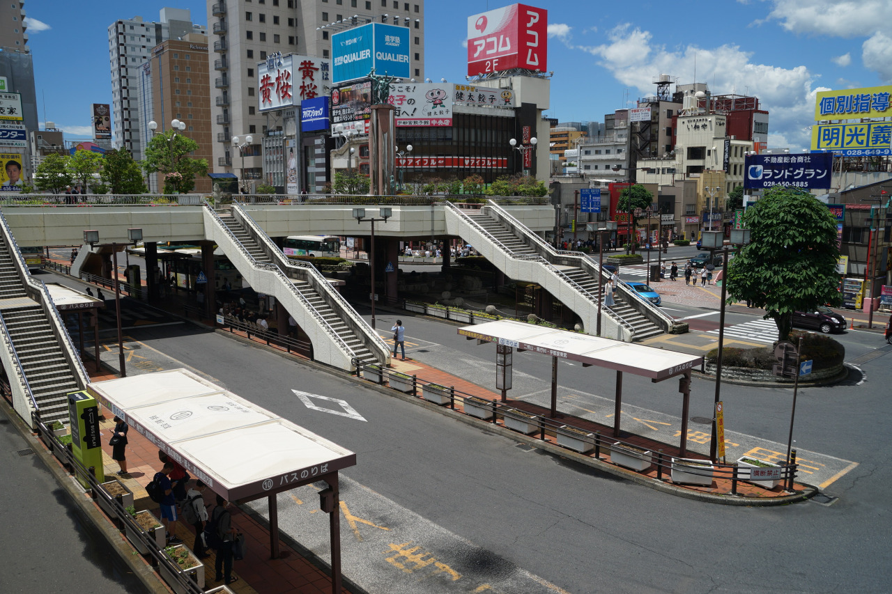 東北新幹線を始め、宇都宮線・日光線・烏山線が集まっています。駅の西口にはバスのターミナル、東口にはライトラインの停留場があり、公共交通機関でな所にいけるため、まさに、宇都宮市の交通の中心と言えます。駅前から西にのびる通りを大通りと呼び、一日中多くの車が行き来しています。駅ビルを含め、周辺には商業ビルが集まり、多くの人々で賑わっています。
