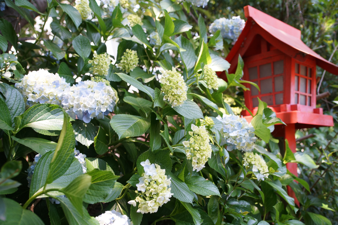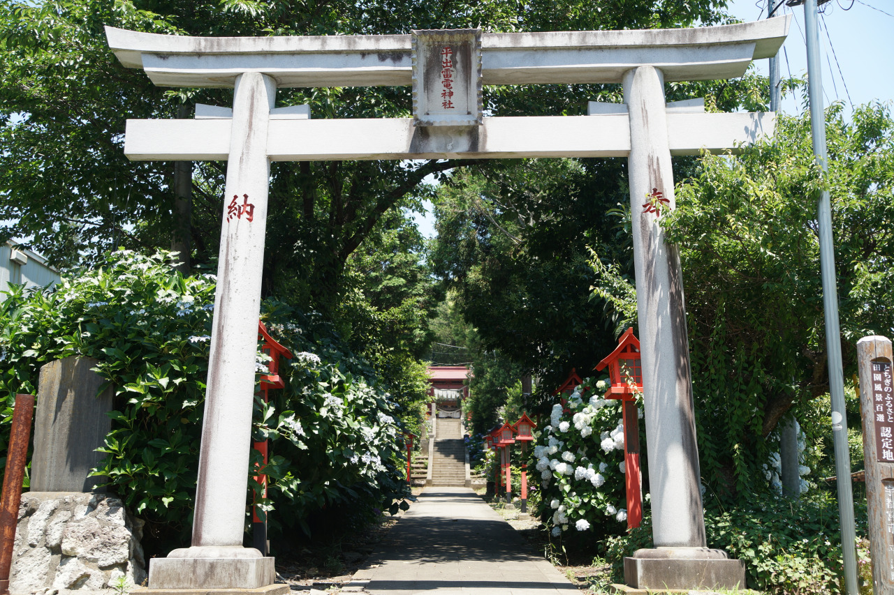 夏の例大祭では梵天が奉納され、南側の鳥居から続く参道の紫陽花が見事な神社。創建は仁和2(886年)に京都の上賀茂大明神(賀茂別雷神社)より御分霊を迎えたと伝わり、雷除け、厄除け、開運、などの御利益があると言われています。