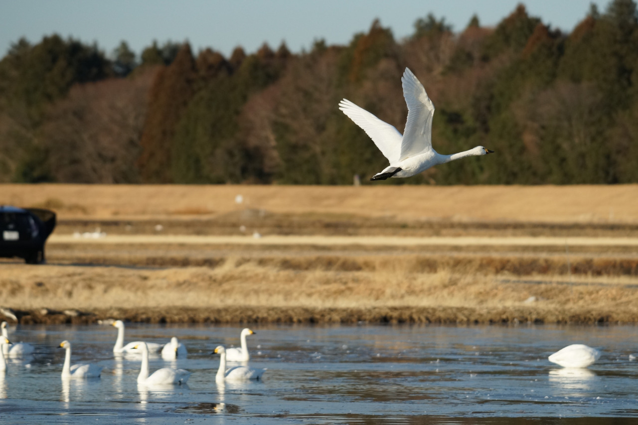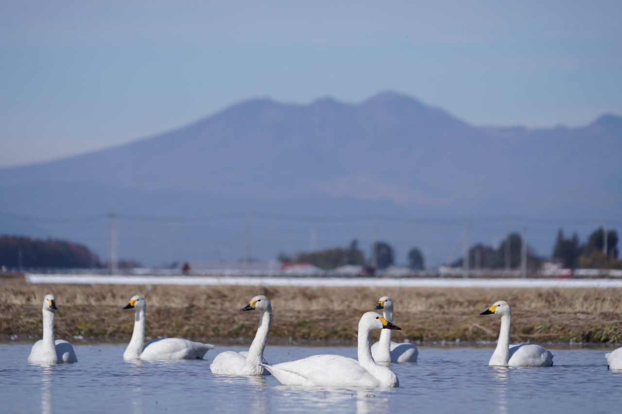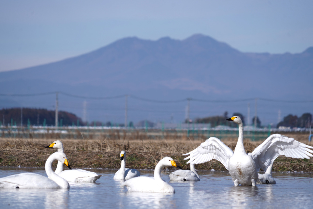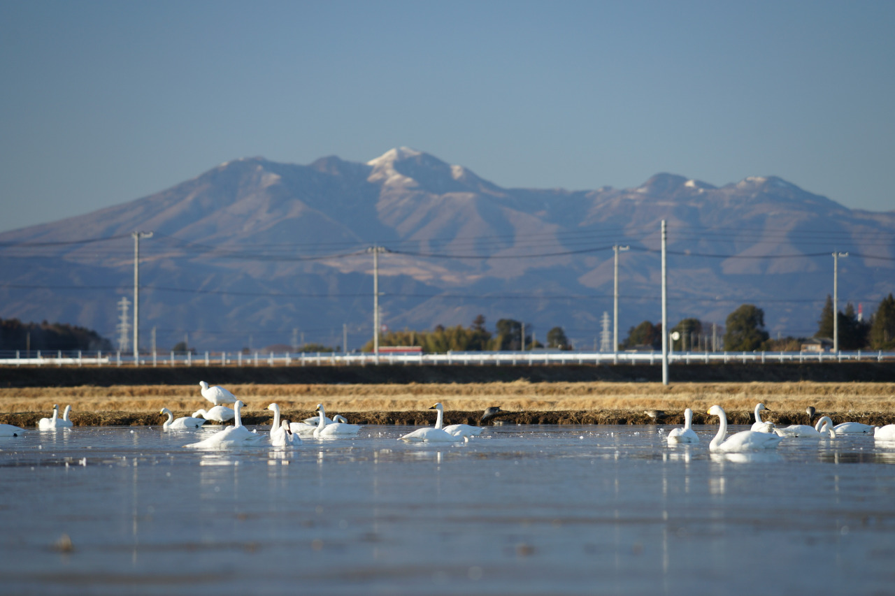 水田は地元住民らでつくる「SK(下ケ橋・河原地区)農村環境保全会」が稲刈り後も水を張ったままにしている「ふゆみずたんぼ」。2010年頃から飛来が見られるようになり、羽黒山や雪をかぶった那須岳を背にする風景は冬の風物詩にもなっています。