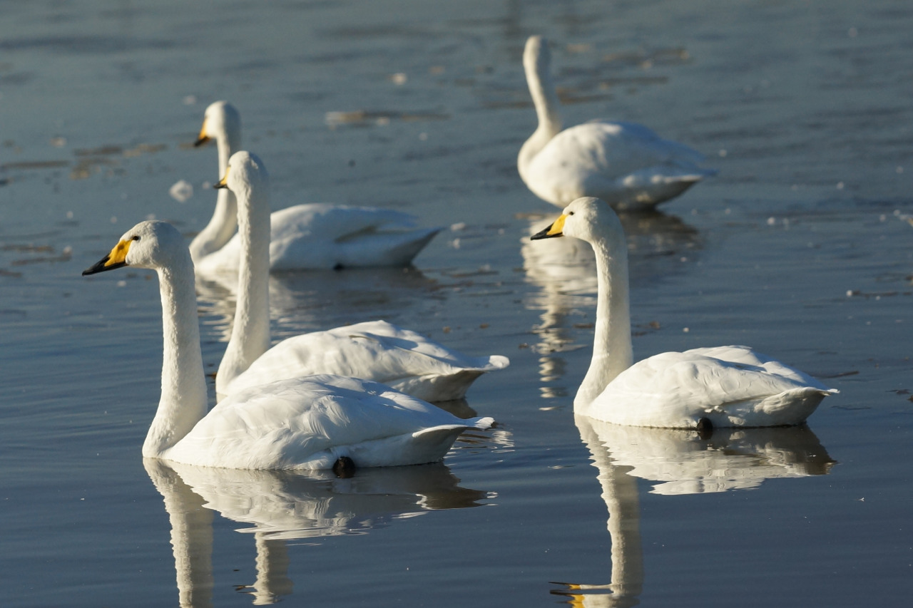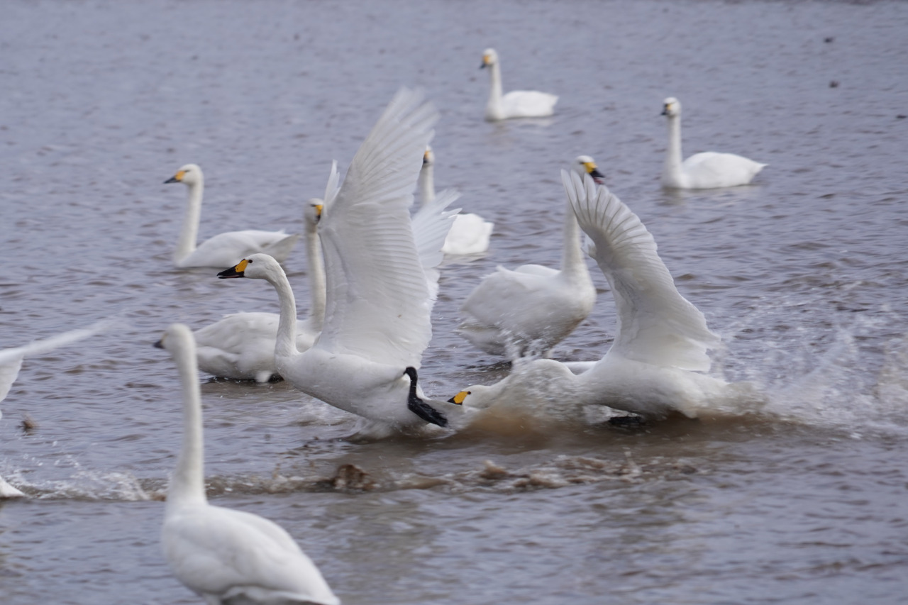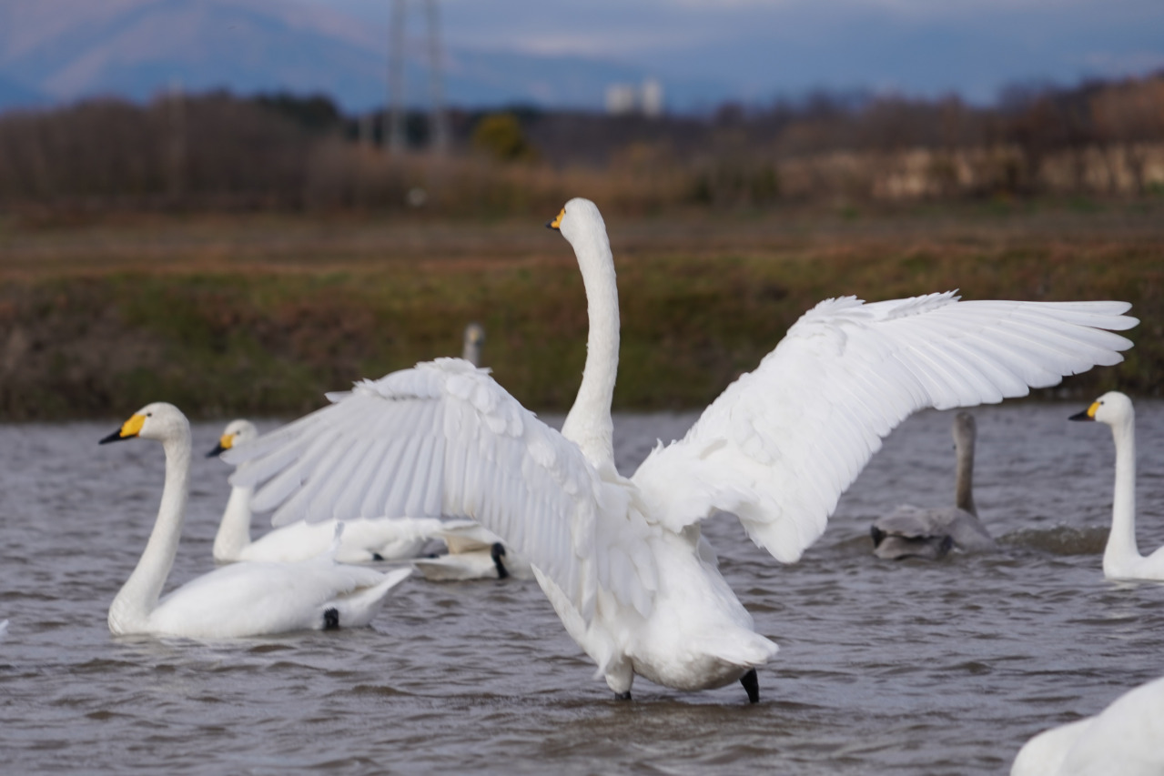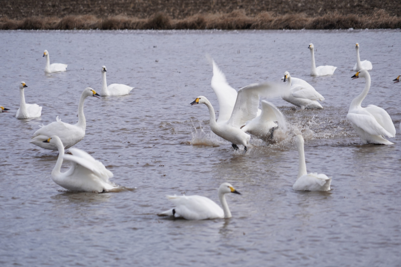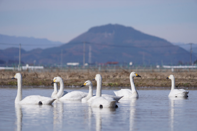水田は地元住民らでつくる「SK(下ケ橋・河原地区)農村環境保全会」が稲刈り後も水を張ったままにしている「ふゆみずたんぼ」。2010年頃から飛来が見られるようになり、羽黒山や雪をかぶった那須岳を背にする風景は冬の風物詩にもなっています。