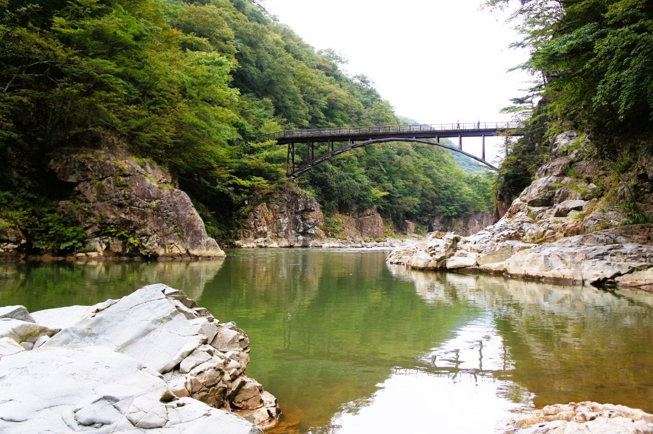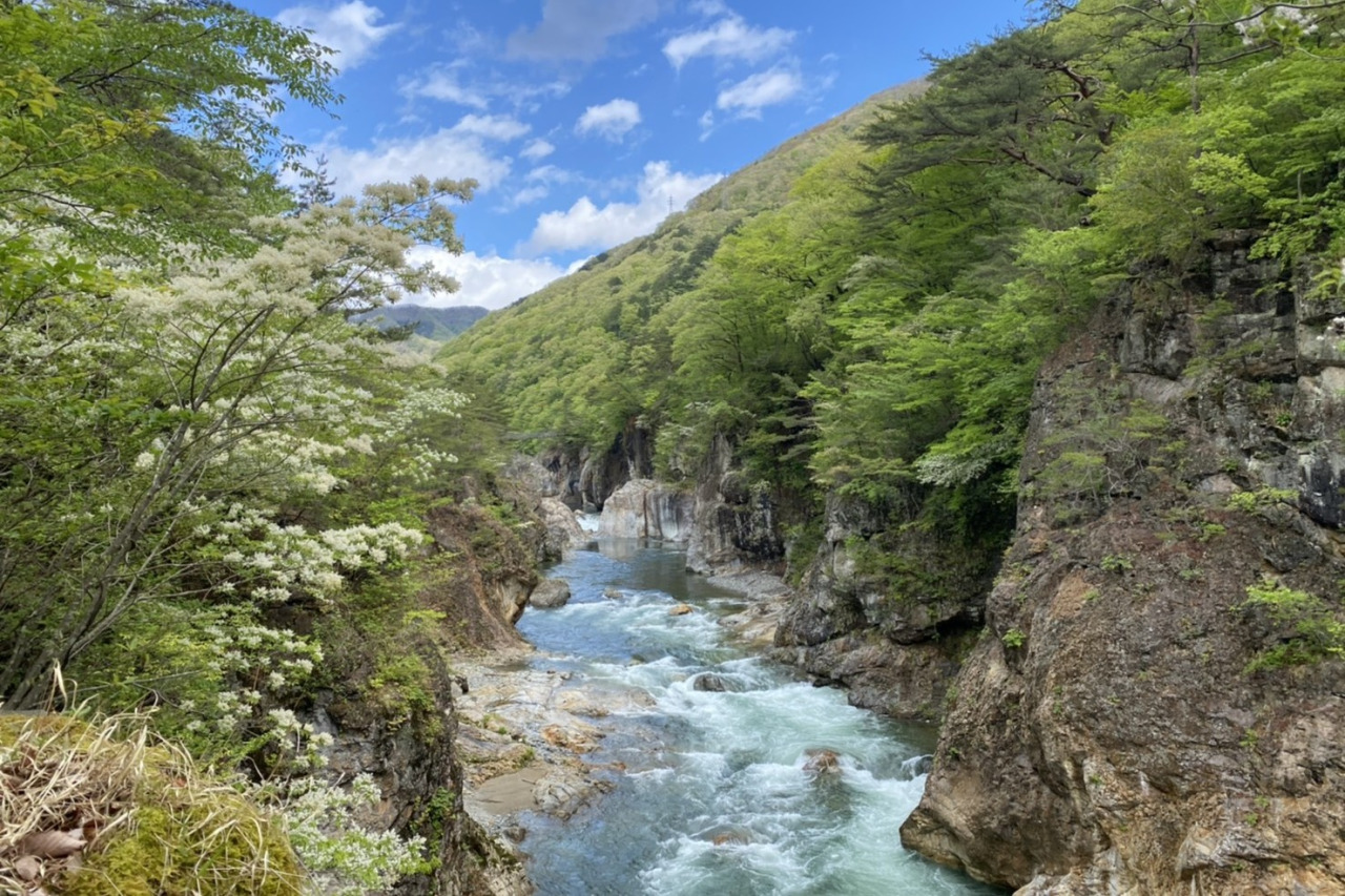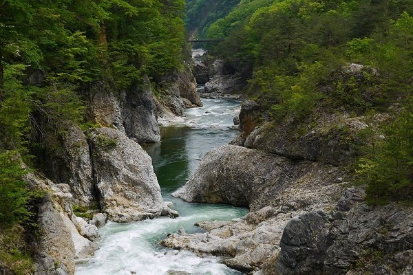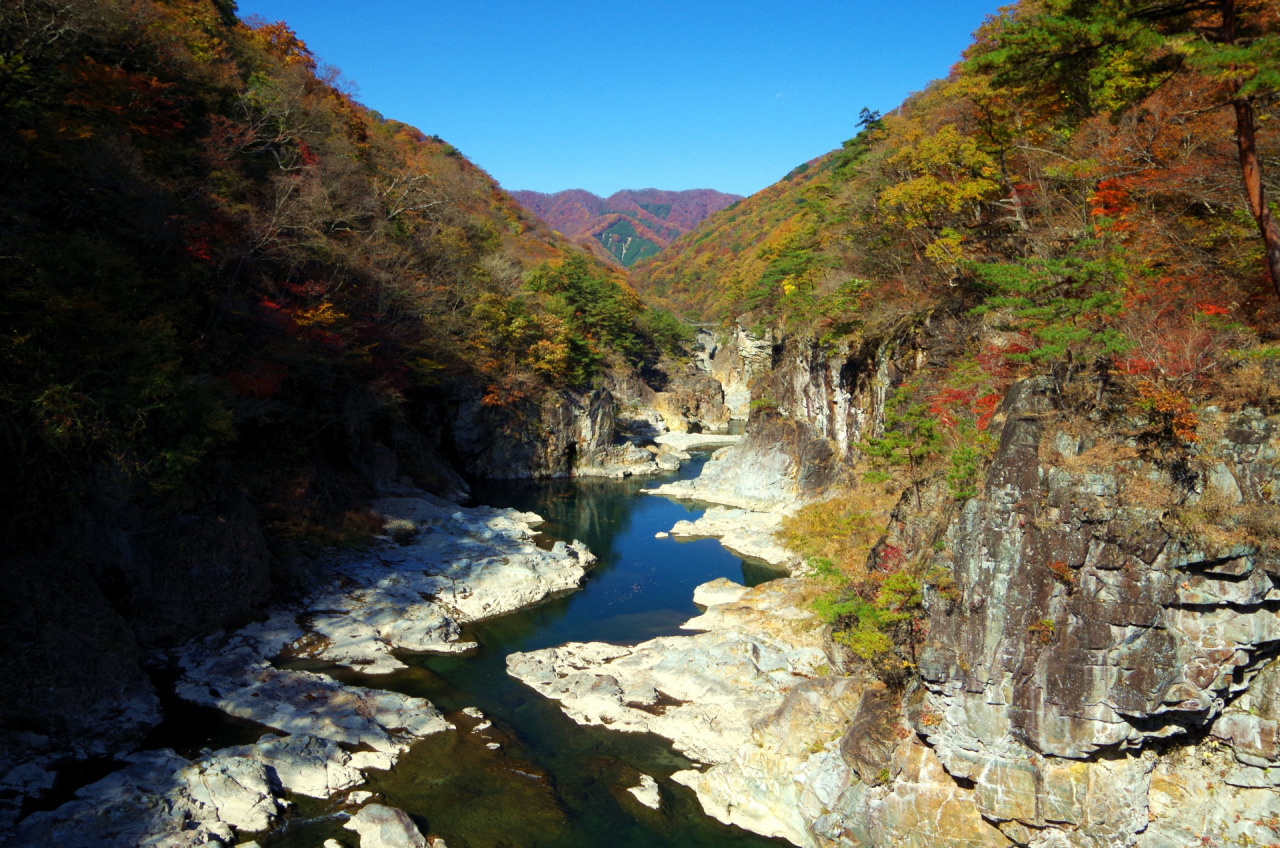 まるで龍がのたうち回るような力強い景観が約3kmにわたって続き、巨岩と清流とがおりなす自然の芸術品が眼前に広がります。特に「むささび橋」からの眺めは、この渓谷でのハイライトで、川面に映える岩肌のコントラストは圧巻の美しさです。