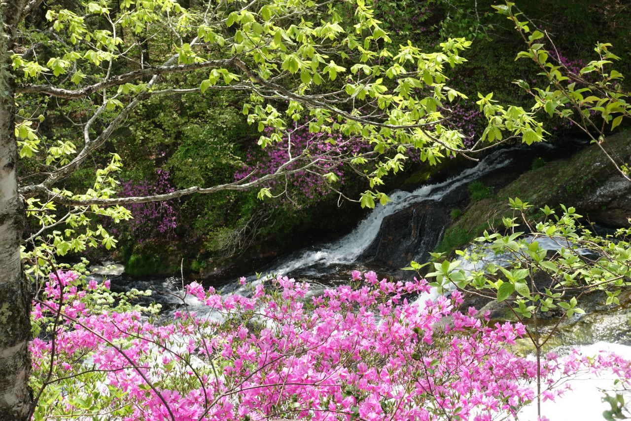幅10mほどの階段状の岩場を勢いよく流れる渓流瀑で、滝つぼ近くが大きな岩によって二分され、その様子が竜の頭に似ていることからこの名がついたといわれています。9月下旬頃からは紅葉の名所として人気が高く、モミジやシナノキなどに彩られた美しい景観が楽しめます。観瀑台から眺める紅葉に彩られた滝つぼの眺めは人気が高く、例年多くのカメラマンが集まります。