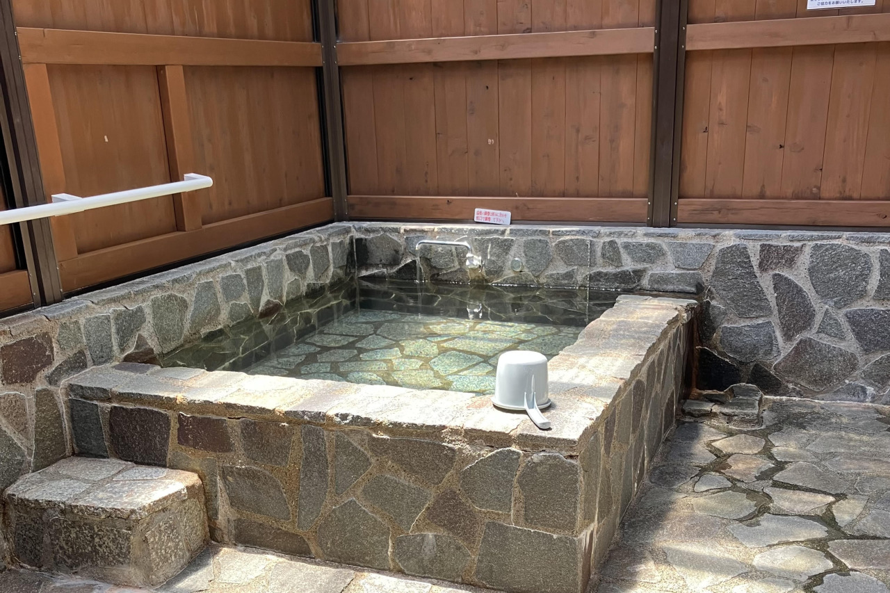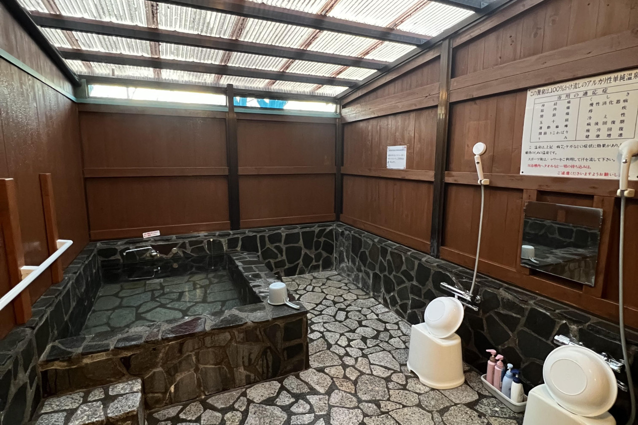 加水・加温一切なし、源泉かけ流しの湯を堪能できる、隠れ家的な日帰り温泉です。石造りの内湯は屋根がついた半露天風呂で、雨の日も快適に湯浴みできます。