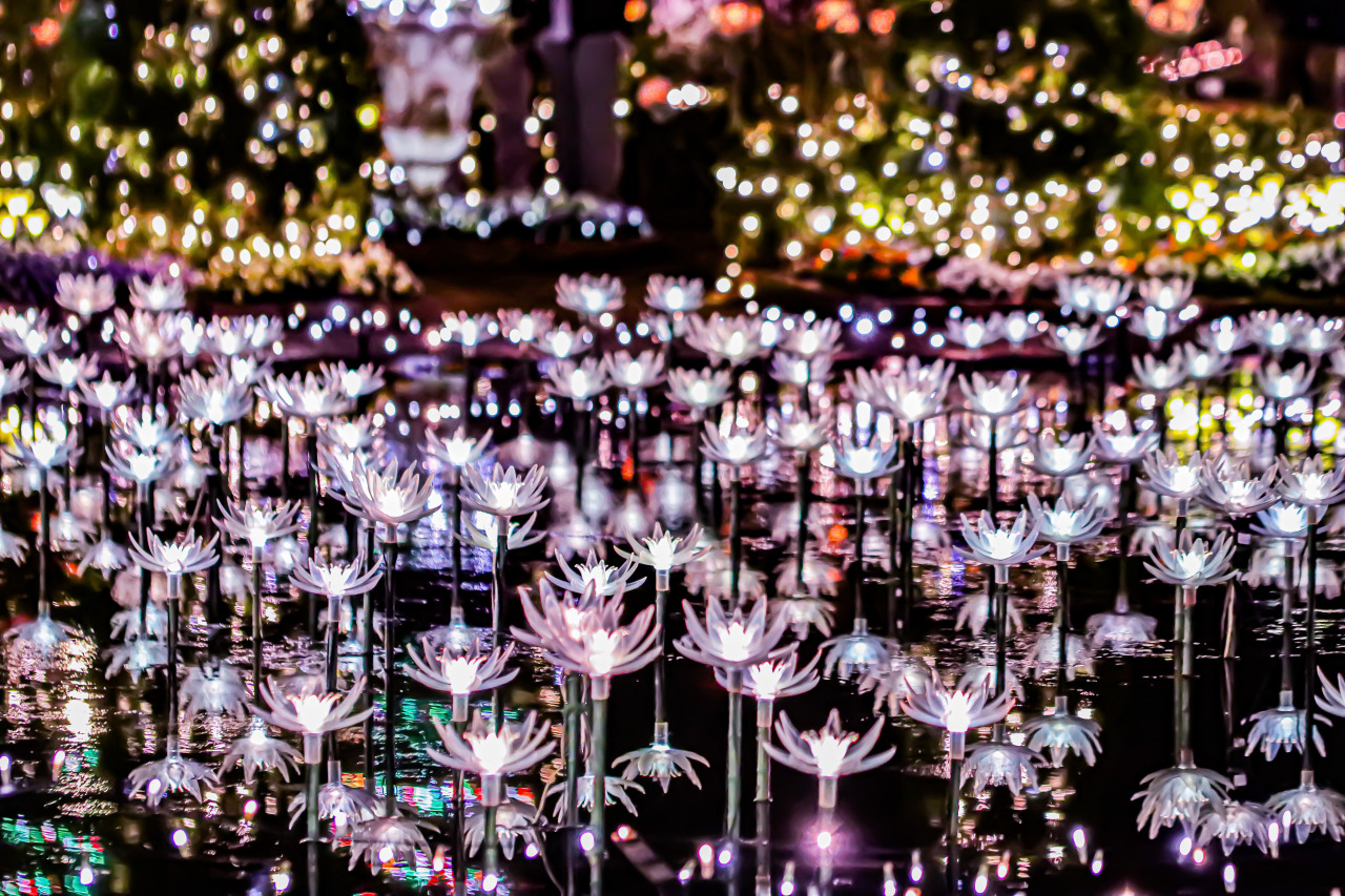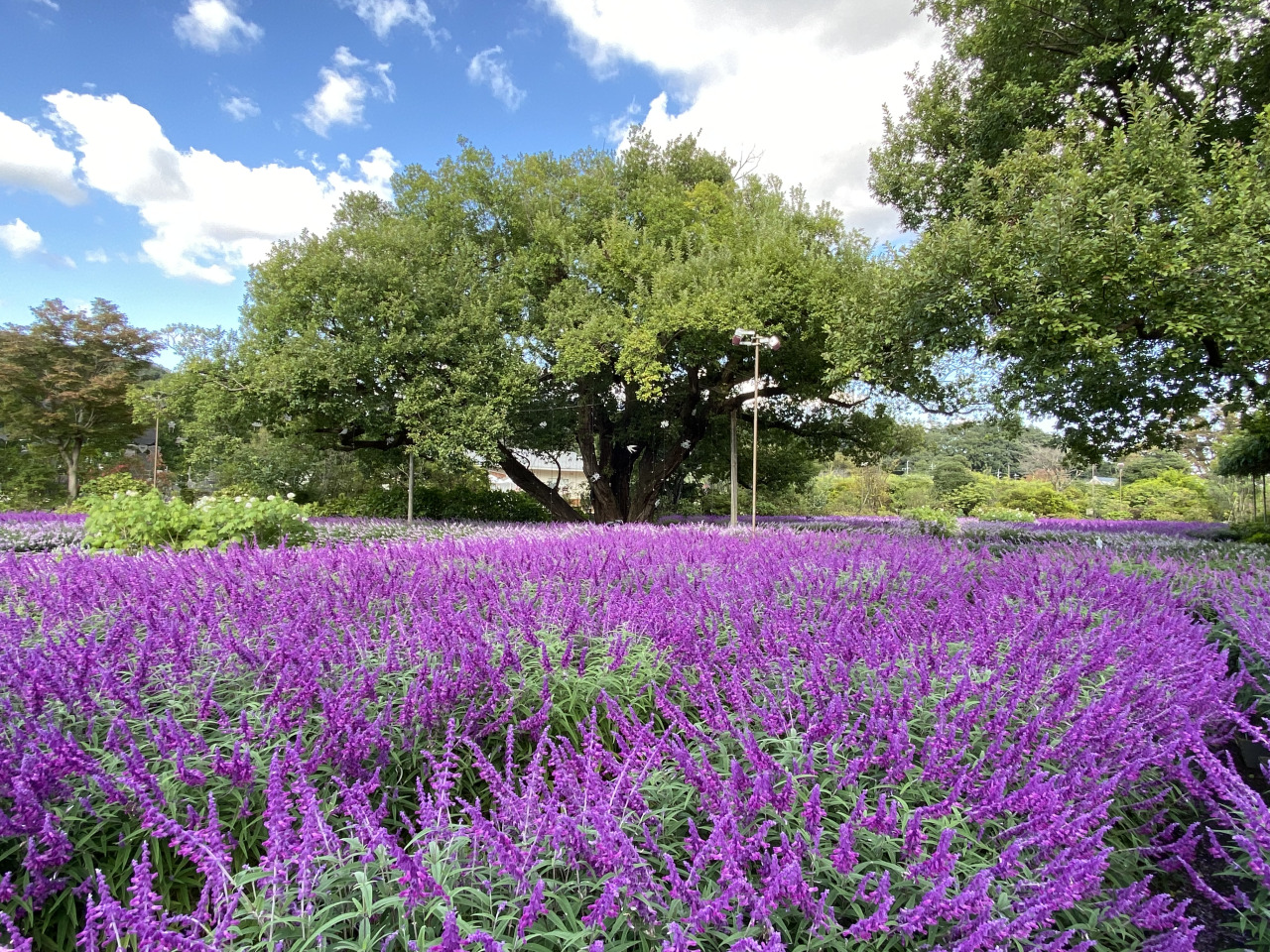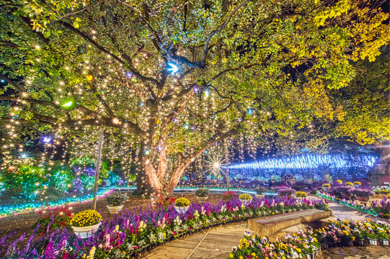 藤はもちろん、チューリップやつつじ、バラ、あじさい、秋のコスモスやアメジストセージなど、季節ごとに咲き誇る花も見どころ。また、花が少なめの冬には、大規模なイルミネーションが園内を華やかに彩ります。約10万平方メートルを500万球以上のLEDが彩り、こちらも非常に人気のあるイベントです。