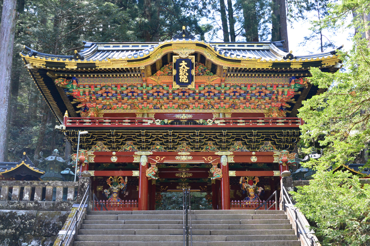 本堂の「三仏堂(さんぶつどう)」は、平安時代に創建された東日本最大級の木造建造物で、千手観音、阿弥陀如来、馬頭観音の三体が祀られています。それぞれ高さ7.5mもある大仏さまが並んだ姿は圧巻です。徳川三代将軍家光公の廟所「大猷院(たいゆういん)」は、国宝に指定され、金と黒を使用した重厚で落ち着いた造りになっています。境内には22の国宝・重要文化財が建ち並びます。